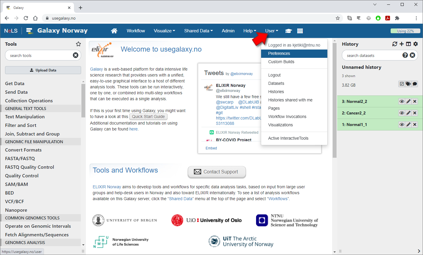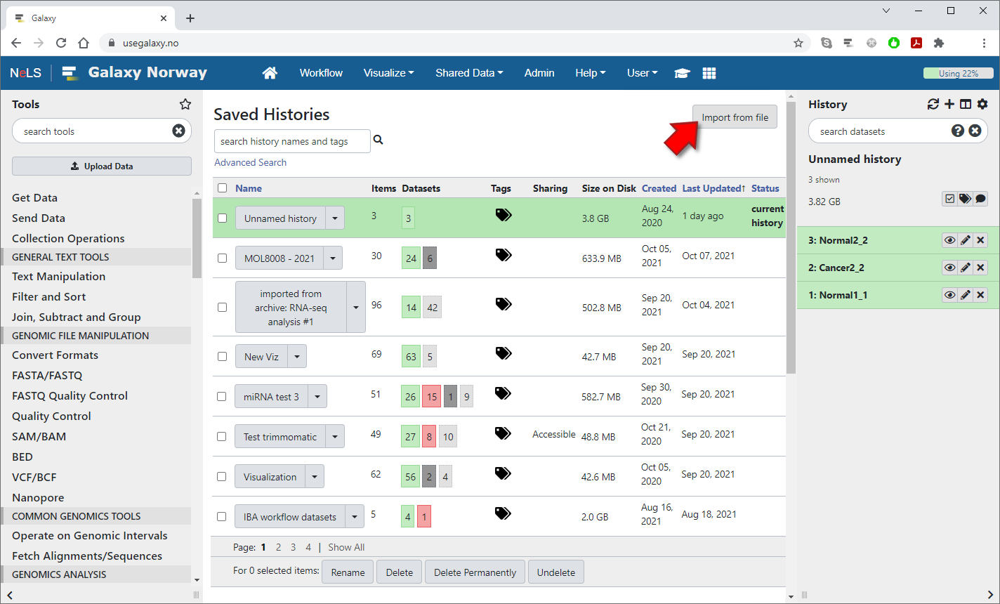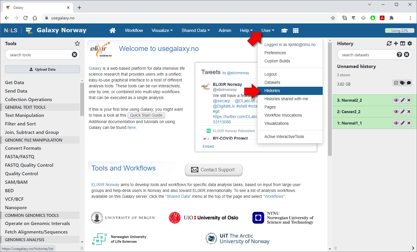 To import a history file from NeLS Storage into Galaxy, select "Histories" from the "User" menu at the top of the page