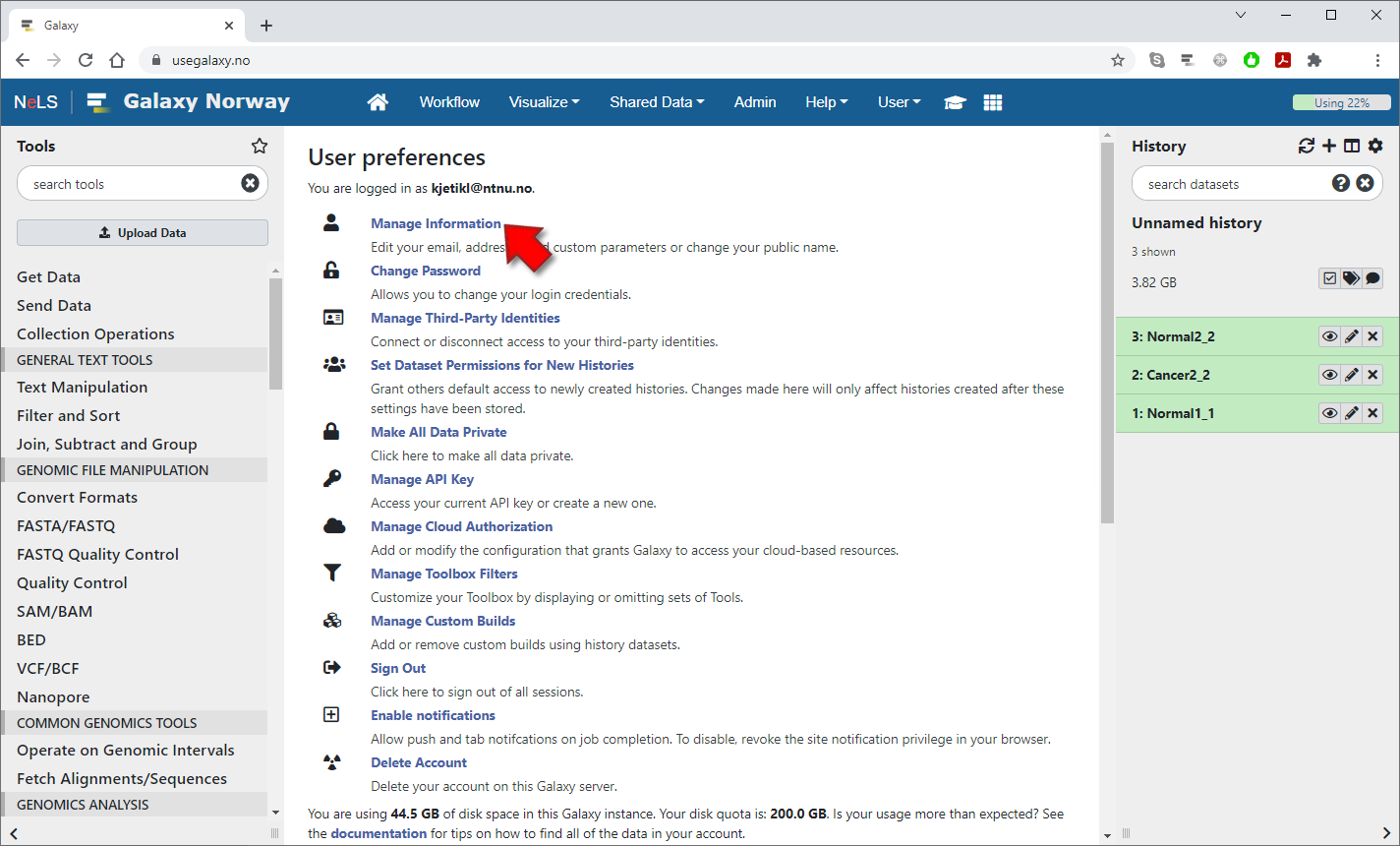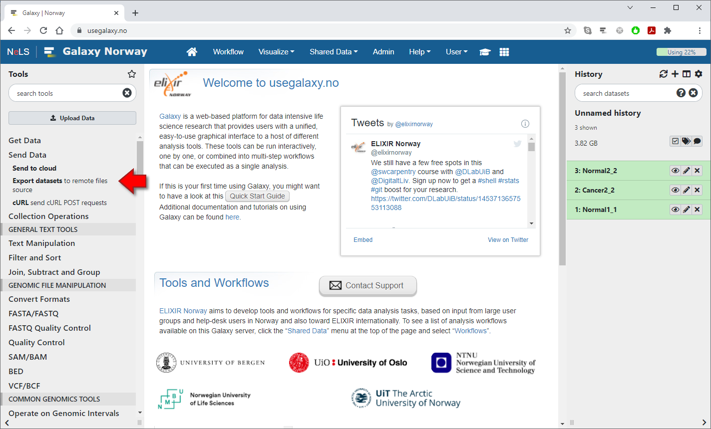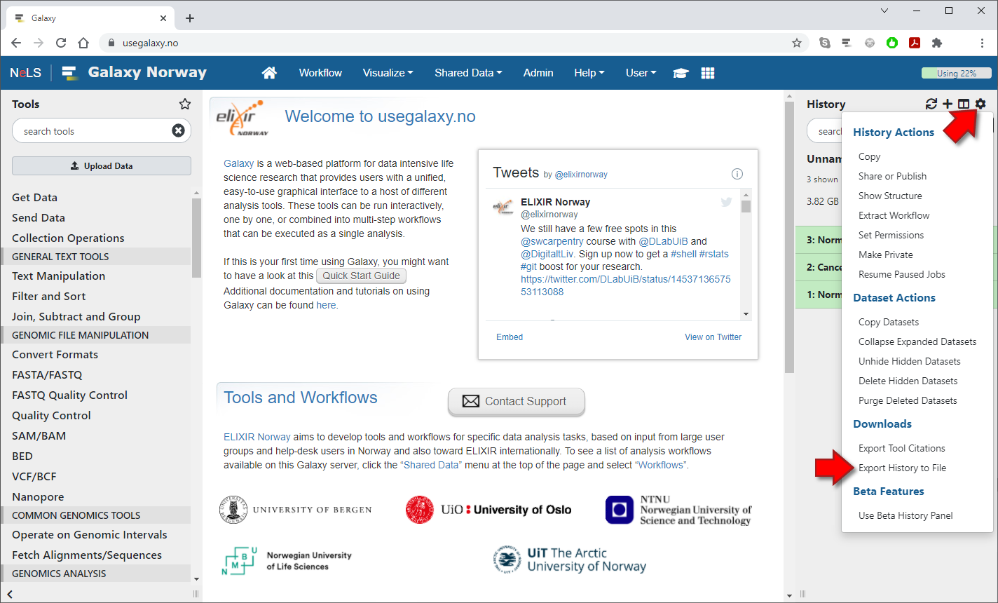 To import a history file from NeLS Storage into Galaxy, select "Histories" from the "User" menu at the top of the page