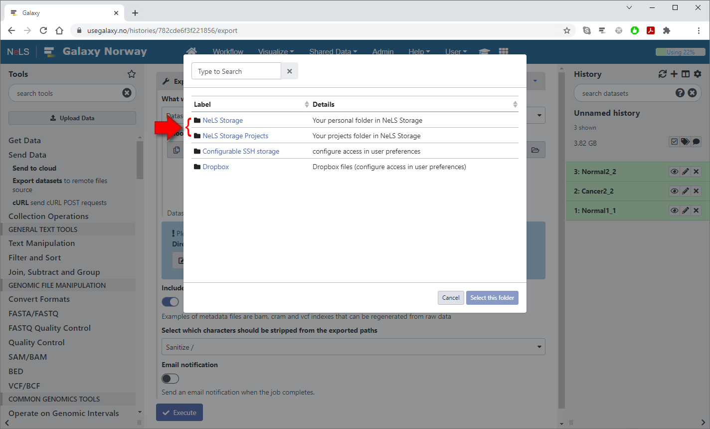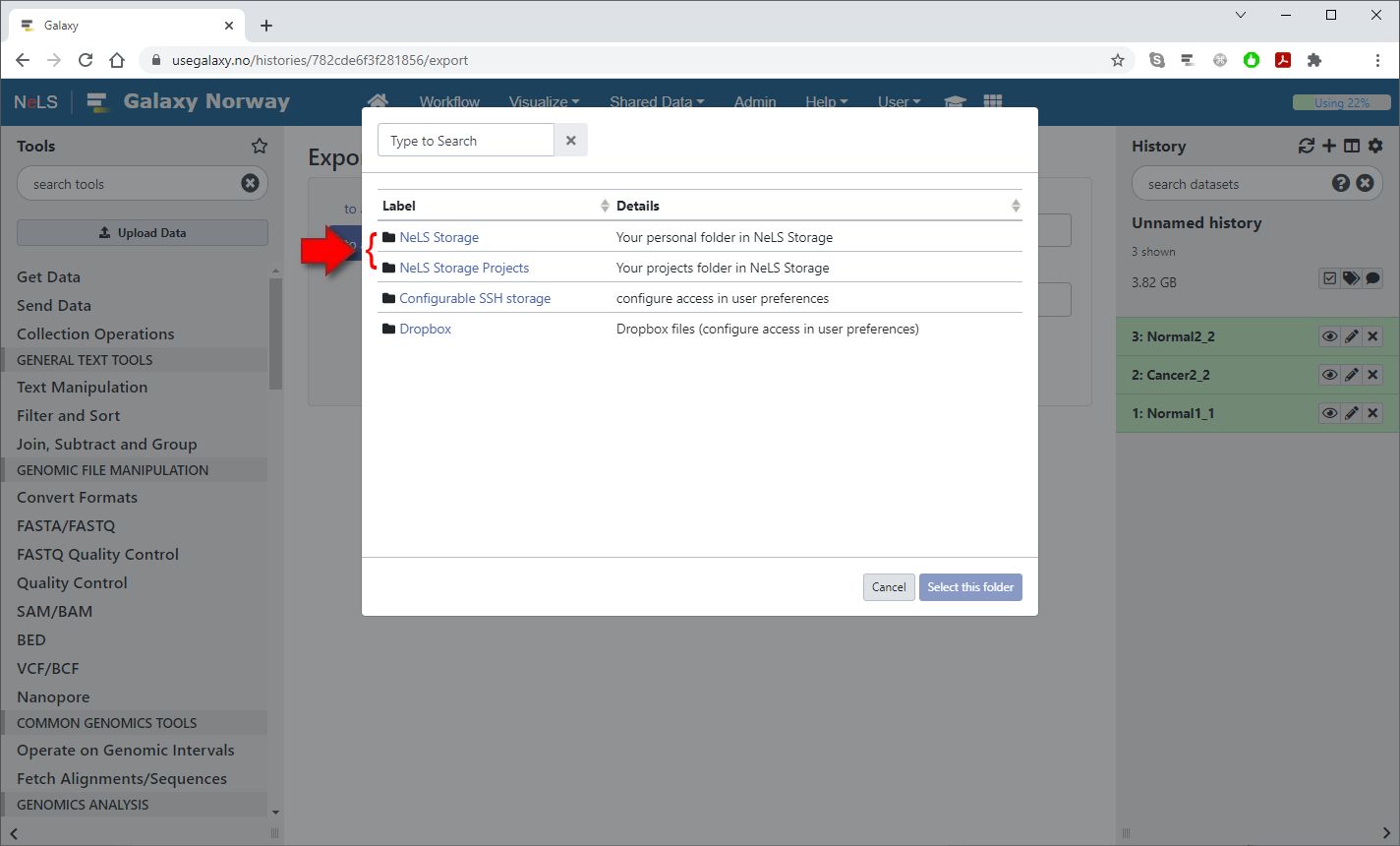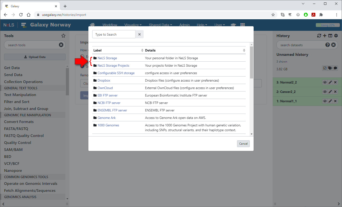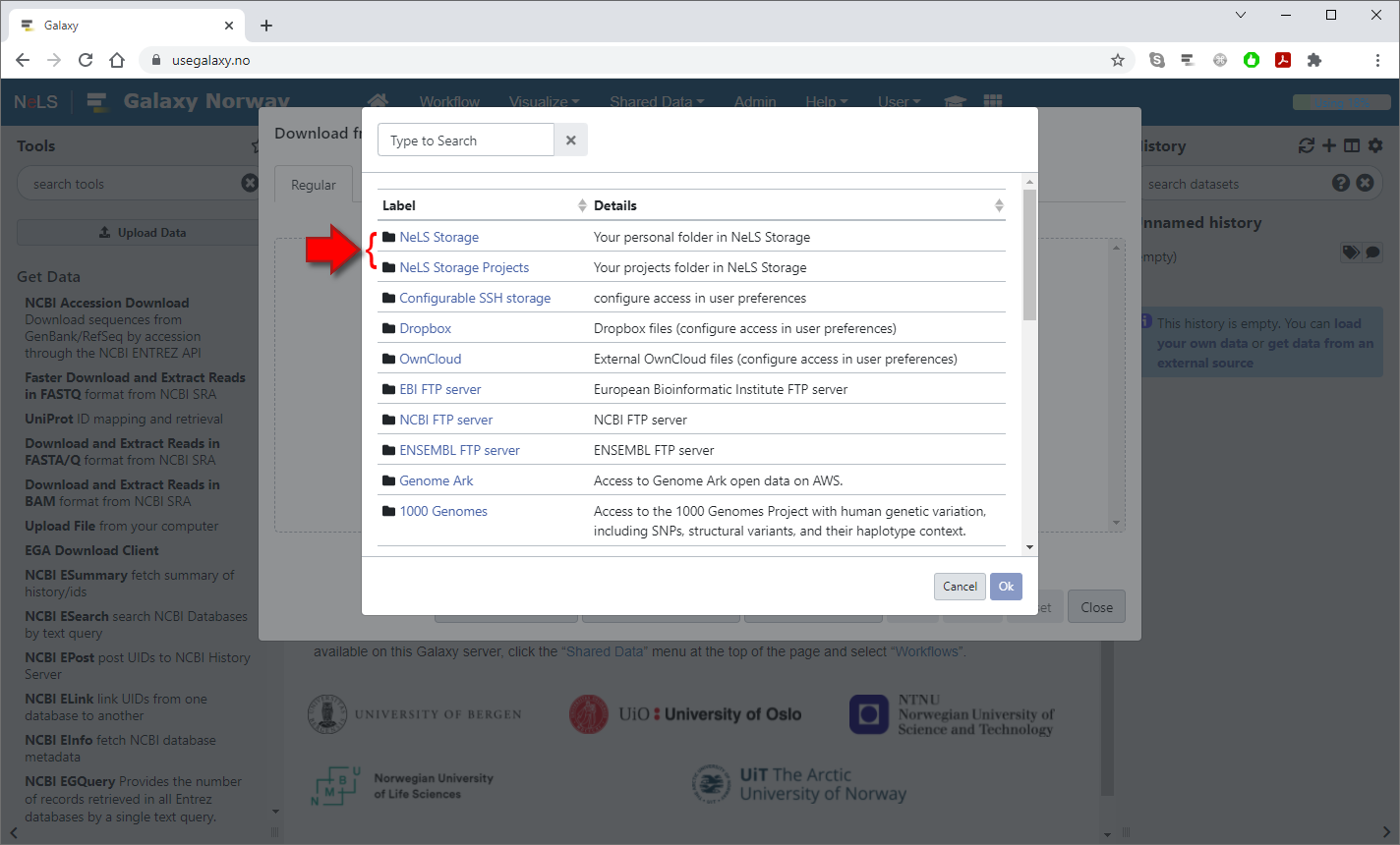 Select "NeLS Storage" or "NeLS Storage Projects" to import a history from either your Personal folder or your Projects folder