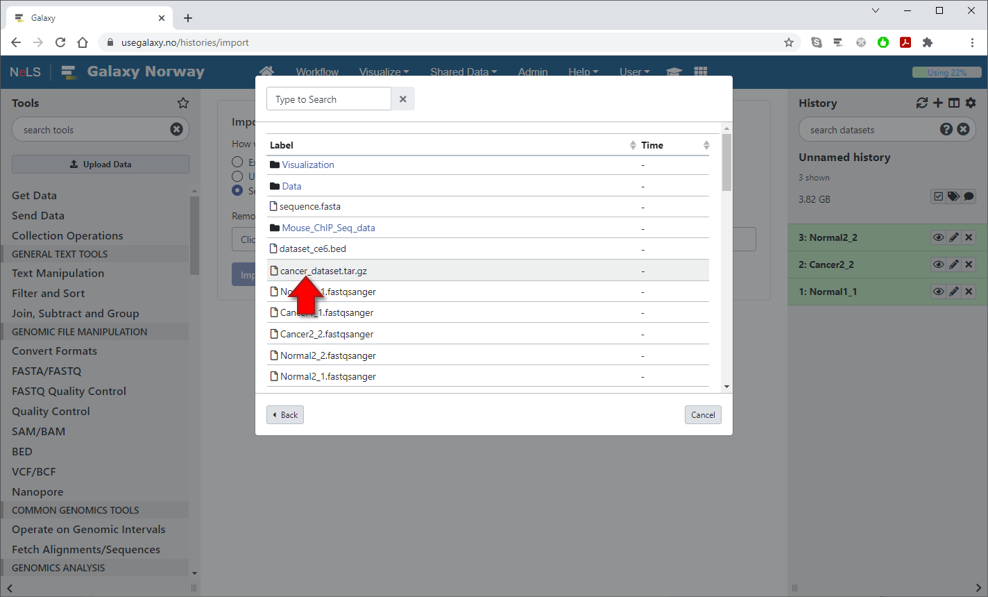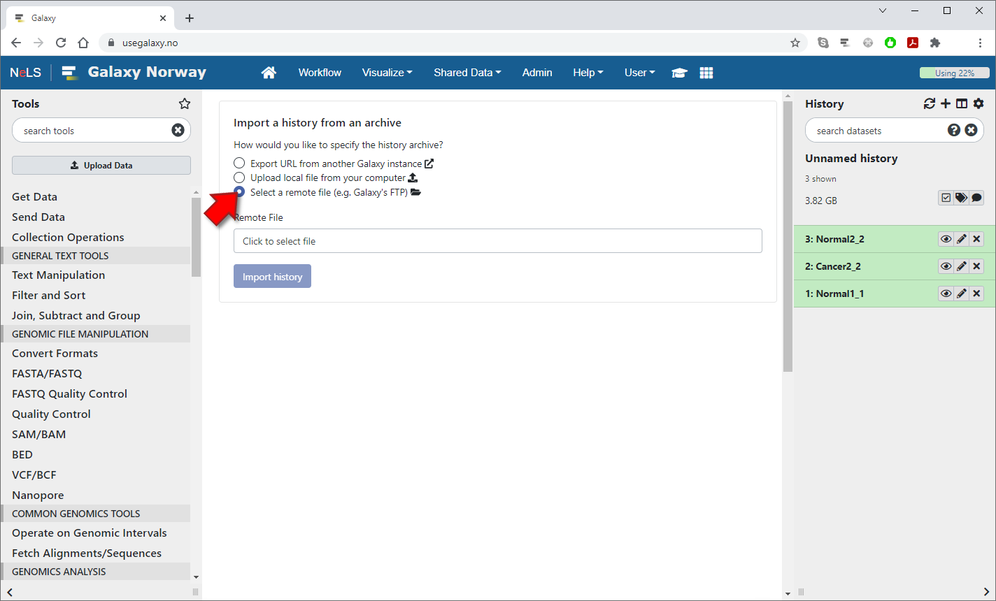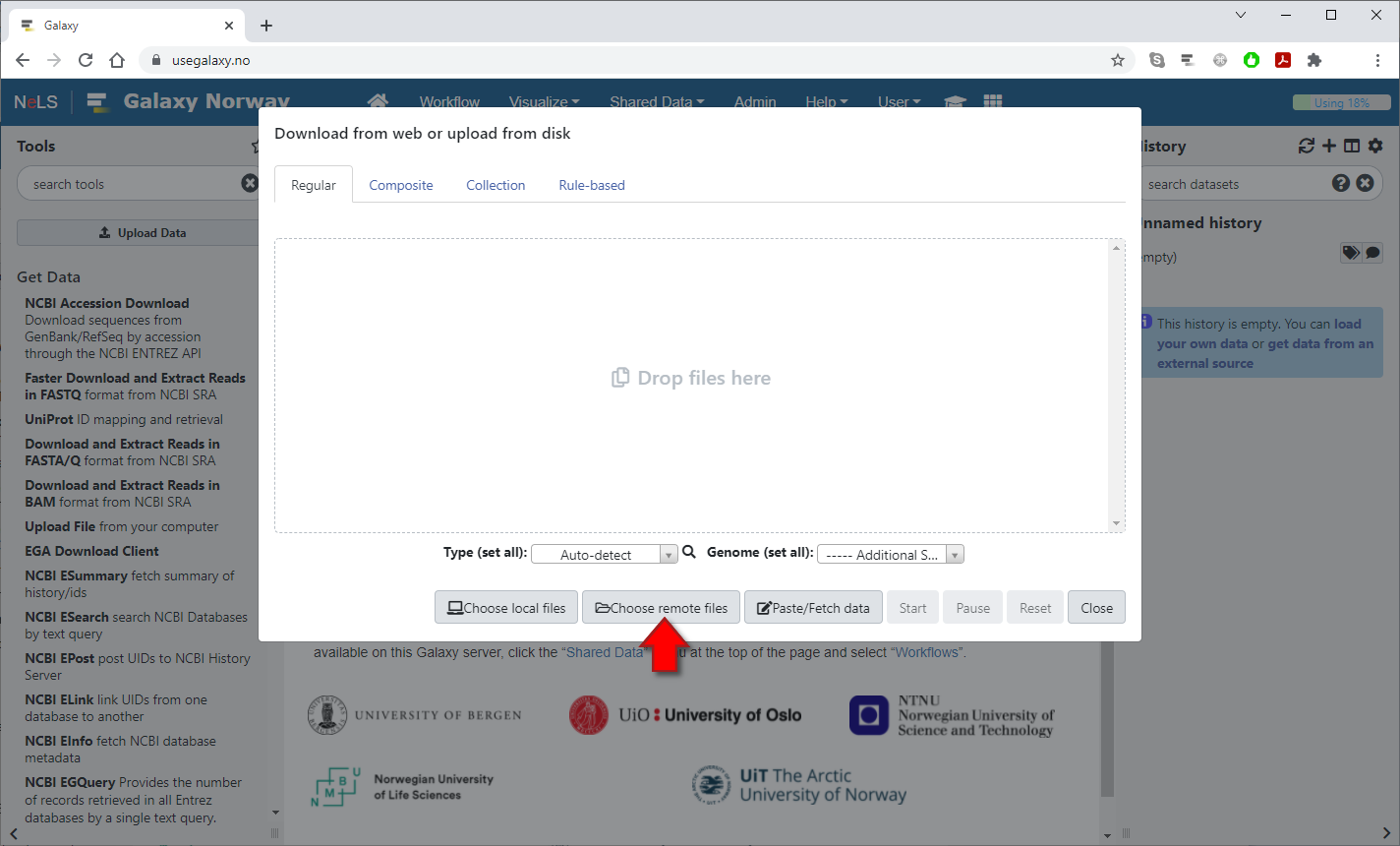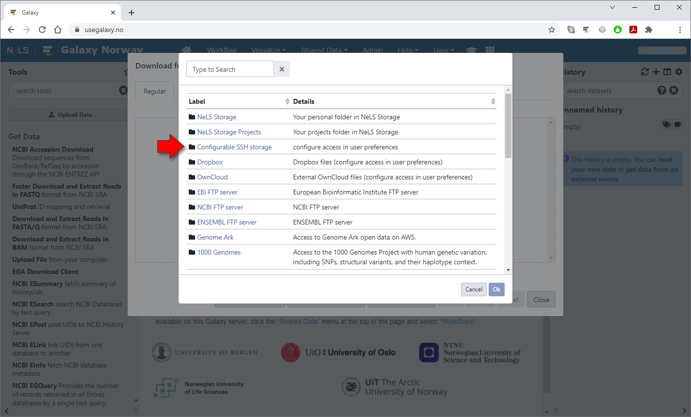 Select "NeLS Storage" or "NeLS Storage Projects" to import a history from either your Personal folder or your Projects folder