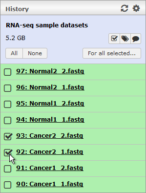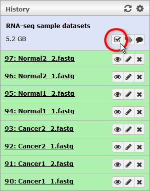 - A few new buttons should now appear, along with checkboxes in front of every dataset in your history. Check off the datasets that you want to include in the collection.