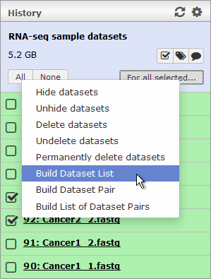- Press the "For all selected..." button to bring up a context menu and select either "Build Dataset List", "Build Dataset Pair" or "Build List of Dataset Pairs" depending on what type of collection you want to create.