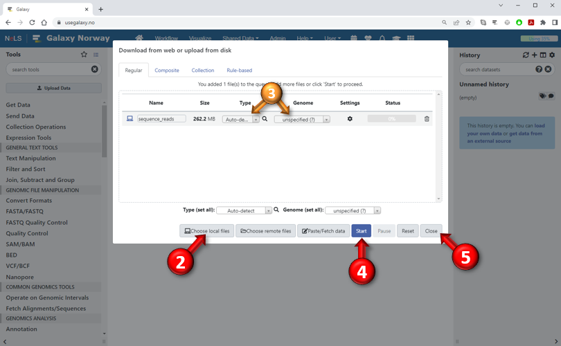 - After you have added a new file to the queue, you can specify the type of the dataset (format) and its associated genome build.